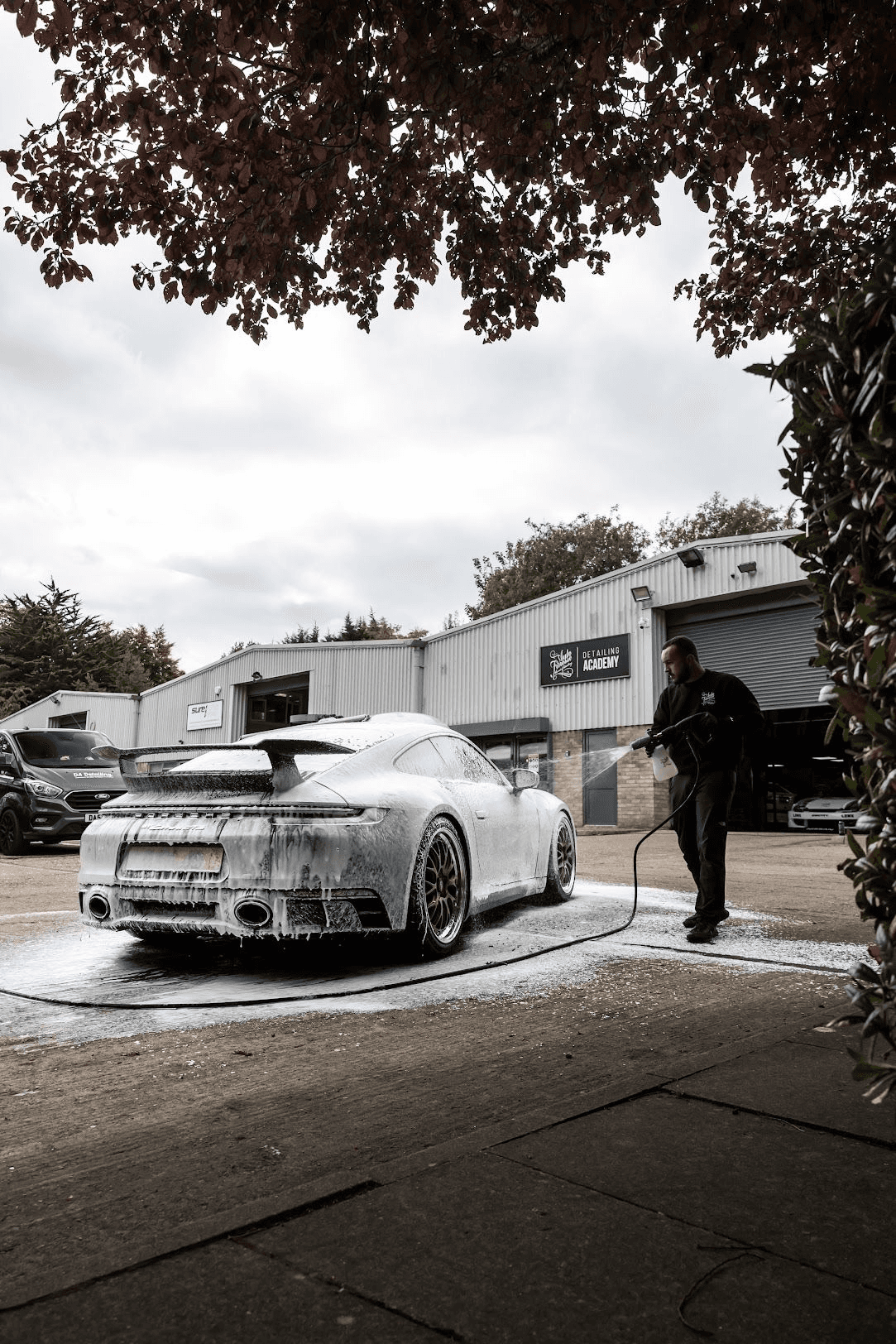 Prélavage mousse active, lavage contact bi-seaux, décontamination et finitions détaillées pour une carrosserie éclatante.